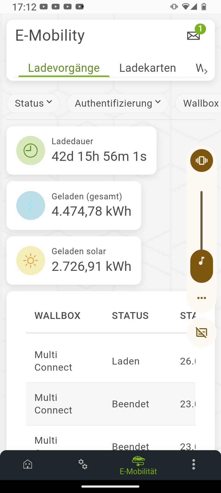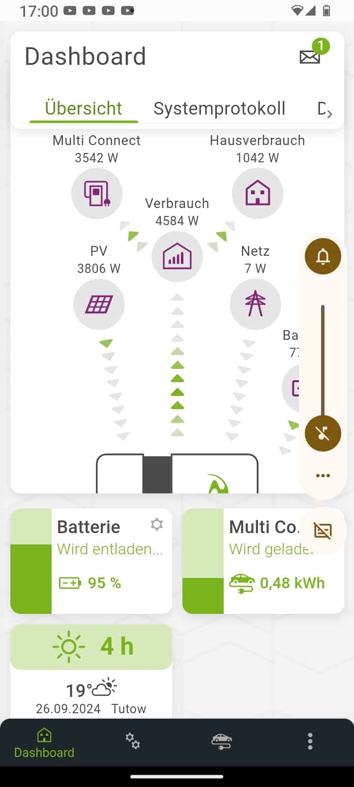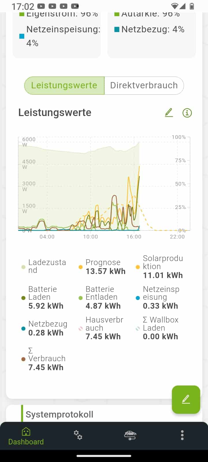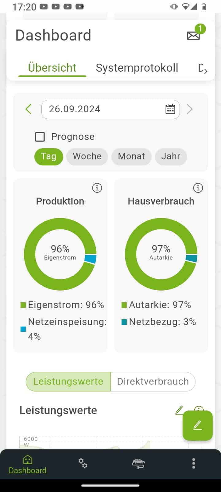 Gudrun: Alles ist miteinander intelligent verknüpft. Mein Mann hat riesigen Spaß dabei, alles über sein Smartphone zu steuern, dabei wollte er bis vor zwei oder drei Jahren nicht mal so ein Gerät besitzen. Wir sind somit stets auf dem Laufenden: die prognostizierte Strommenge für den Folgetag, der Stand der Batterieentladung, wie viel Strom wir über die Wallbox geladen haben und wie viel Strom im Haus verbraucht wird, bzw. wie viel wir ins Netz abgeben. Der Vorteil ist, dass wir nun auch wenn wir nicht zuhause sind Zugriff auf die Technik haben. Wir können den Ladeprozess am Auto gezielt dann beginnen, wenn die Sonne ausreichend scheint oder festlegen, dass der Speicher die höchste Ladepriorität hat. Ich habe einige Screenshots aus der Steuerung angefertigt, um unseren erreichten Autarkiegrad zu veranschaulichen. So hatten wir zum Beispiel am 26.09.2024 dieses Jahres noch eine Autarkie von 97 Prozent und konnten 96 Prozent unseres Eigenstroms selbst nutzen.