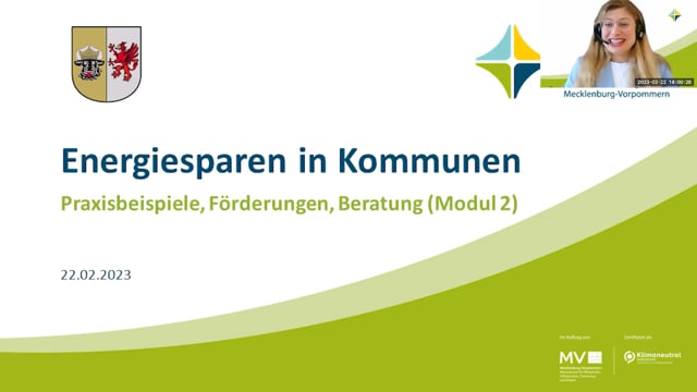 Die Schulungsaufzeichnung „Energiesparen in Kommunen – Praxisbeispiele, Förderungen, Beratungen“ von der Landesenergie- und Klimaschutzagentur Mecklenburg-Vorpommern GmbH (LEKA MV) bietet umfassende Informationen und Einblicke in das Thema Energiesparen speziell für Kommunen. Es hat eine Laufzeit von etwa 100 Minuten. Die Inhalte des Videos in Kürze: