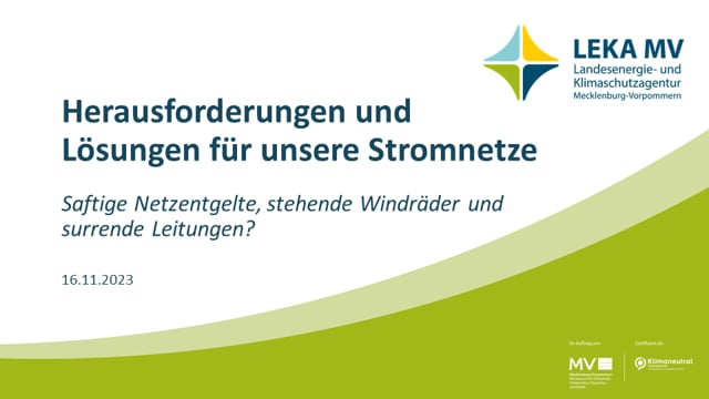 Die Schulungsaufzeichnung „Herausforderungen & Lösungen für unsere Stromnetze – Saftige Netzentgelte, stehende Windräder und surrende Leitungen“ der Landesenergie- und Klimaschutzagentur Mecklenburg-Vorpommern GmbH (LEKA MV) behandelt die komplexen Herausforderungen, die die Energiewende für die Stromnetze in Deutschland mit sich bringt. Es bietet einen tiefen Einblick in die Funktionsweise, Kosten und die Auswirkungen der Energiewende auf die Stromnetze. Die Inhalte des Videos in Kürze: