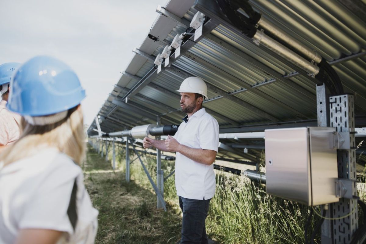 - Kommunalvertreter*innen lassen sich die Funktionsweise der großflächigen Solarthermieanlage erläutern