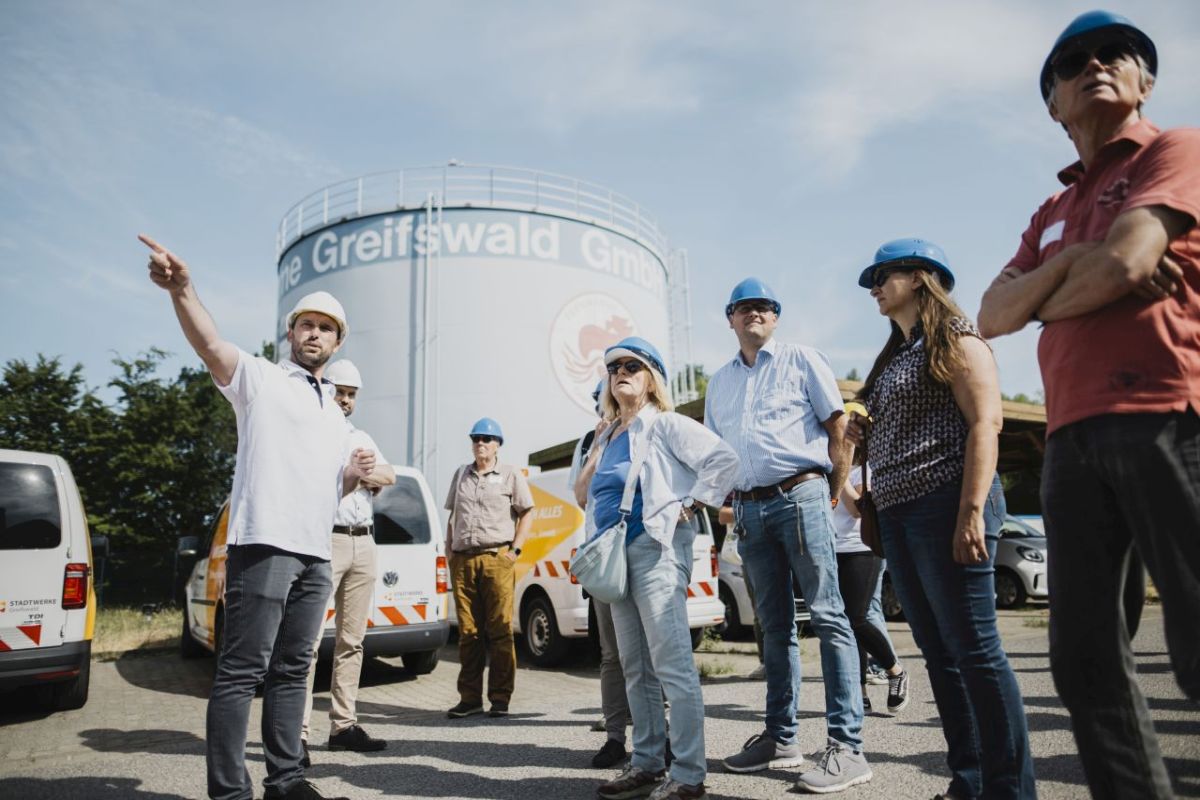 In der nahe des Kraftwerksparks gelegenen Speisewerft Greifswald konnten die Teilnehmenden zunächst einer fachlichen Einführung ins Thema durch die Stadtwerke Greifswald folgen. Robert Kauert, Bereichsleiter Erzeugung und Wassergewinnung sowie Prokurist der Stadtwerke gab einen Einblick in die Wärmeversorgung und den Transformationsplan der Wärmeversorgung: Die Hansestadt verfügt über mehrere Energieerzeugungsanlagen, die über das Stadtgebiet verteilt sind. Insgesamt wird Wärme über ein 90 Kilometer langes Fernwärmenetz in die Haushalte geliefert. Während der Führung über das Kraftwerksgelände beantwortete Kraftwerksleiter Rico Donath den Anwesenden viele Einzelfragen und ermöglichte anhand eines Anschauungsmodells, die Wärme zu spüren.